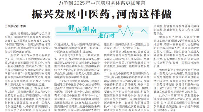 近日,记者获悉,省政府办公厅日前公布《河南省中医药振兴发展实施方案》,加大“十四五”期间对中医药发展的支持和促进力度,着力推动中医药振兴发展,加快中医药强省建设。(今日《河南日报》4版)