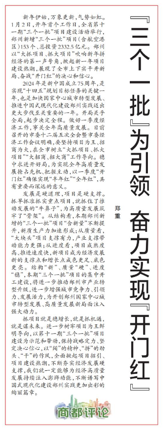 新年伊始,万象更新,气势如虹。1月2日,开年首个工作日,全省第十一期“三个一批”项目建设活动举行,郑州新增“三个一批”项目(含航空港区)153个、总投资2332.5亿元。郑州以“大抓项目、抓大项目”吹响新年拼经济的第一声号角,掀起新一年项目建设热潮,展现了全市上下实干开新局、奋战“开门红”的决心和信心。(今日《郑州日报》1版)