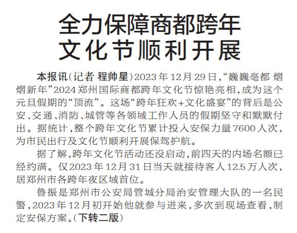 2023年12月29日,“巍巍亳都 熠熠新年”2024郑州国际商都跨年文化节惊艳亮相,成为这个元旦假期的“顶流”。这场“跨年狂欢+文化盛宴”的背后是公安、交通、消防、城管等各领域工作人员的假期坚守和默默付出。据统计,整个跨年文化节累计投入安保力量7600人次,为市民出行及文化节顺利开展保驾护航。(今日《郑州日报》1版、2版)