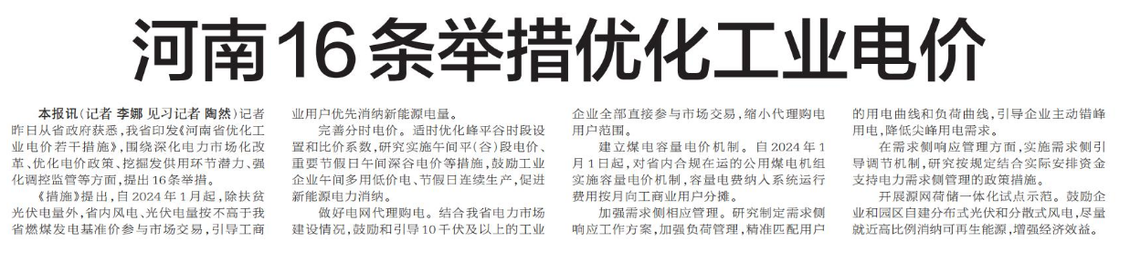 河南16条举措优化工业电价