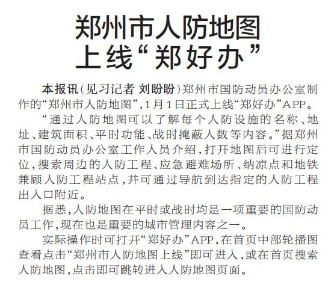 郑州市国防动员办公室制作的“郑州市人防地图”,1月1日正式上线“郑好办”APP。(今日《郑州日报》2版)