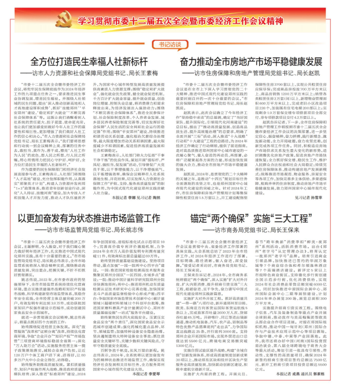 “市委十二届五次全会暨市委经济工作会议是贯彻中央、省委经济工作部署的具体实践,大会系统总结了2023年全市经济工作,对2024年经济工作进行了部署,目标明确、路径清晰,催人奋进,深受鼓舞。”接受记者采访时,市商务局党组书记、局长王保来说。(今日《郑州日报》3版)