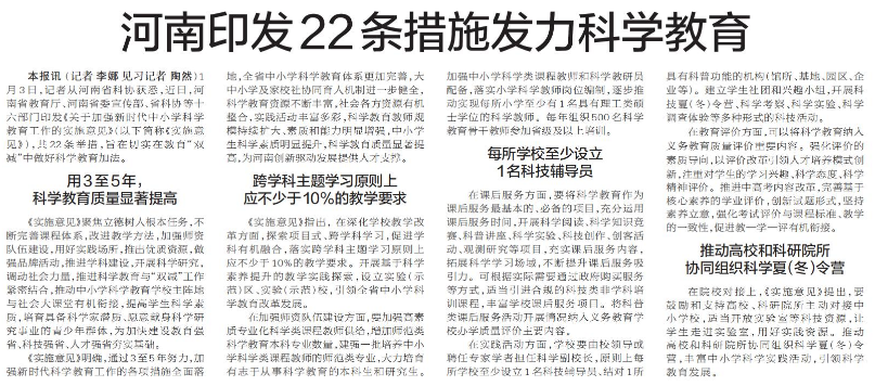 1月3日,记者从河南省科协获悉,近日,河南省教育厅、河南省委宣传部、省科协等十六部门印发《关于加强新时代中小学科学教育工作的实施意见》(以下简称《实施意见》),共22条举措,旨在切实在教育“双减”中做好科学教育加法。(今日《郑州日报》5版)