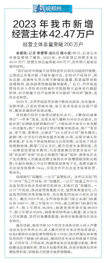 昨日,记者从市市场监管局了解到,2023年,全市新登记经营主体达42.47万户,经营主体总量突破200万户,居中部六省省会城市前列。(今日《郑州日报》6版)