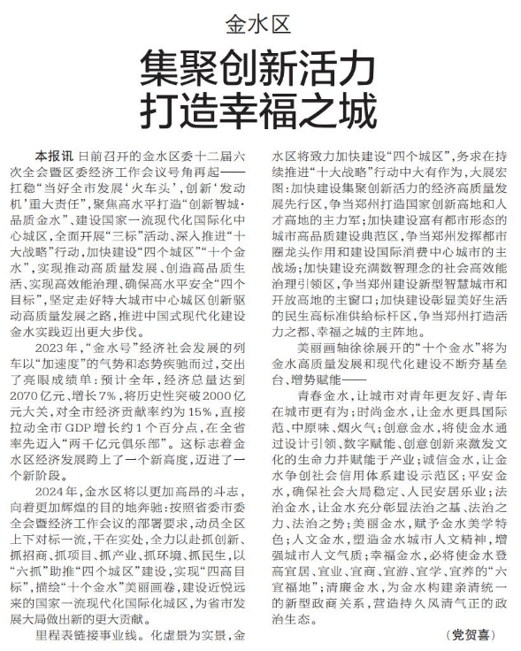 日前召开的金水区委十二届六次全会暨区委经济工作会议号角再起——扛稳“当好全市发展‘火车头’,创新‘发动机’重大责任”,聚焦高水平打造“创新智城·品质金水”、建设国家一流现代化国际化中心城区,全面开展“三标”活动、深入推进“十大战略”行动,加快建设“四个城区”“十个金水”,实现推动高质量发展、创造高品质生活、实现高效能治理、确保高水平安全“四个目标”,坚定走好特大城市中心城区创新驱动高质量发展之路,推进中国式现代化建设金水实践迈出更大步伐。(今日《郑州日报》7版)