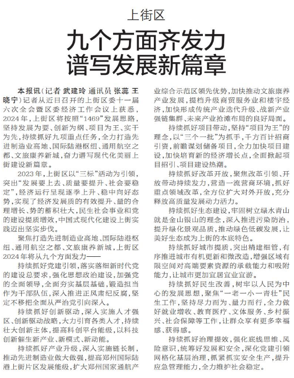 记者从近日召开的上街区委十一届六次全会暨区委经济工作会议上获悉,2024年,上街区将按照“1469”发展思路,坚持发展为要、创新为纲、项目为王、实干为先,持续抓好九项重点任务,全力打造先进制造业高地、国际陆港枢纽、通用航空之都、文旅康养新城,奋力谱写现代化美丽上街建设新篇章。(今日《郑州日报》7版)