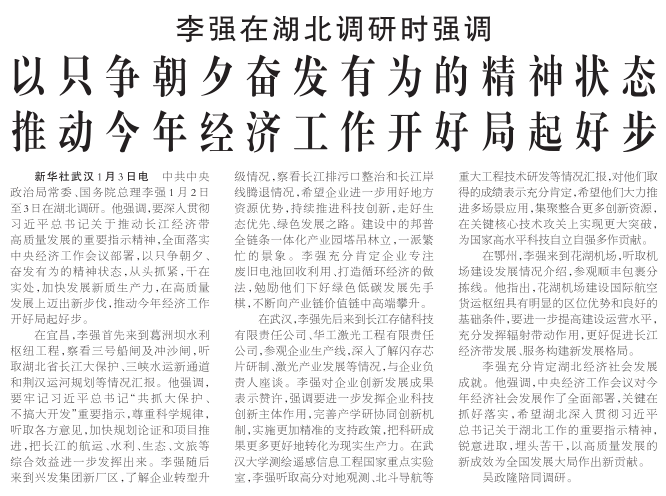 中共中央政治局常委、国务院总理李强1月2日至3日在湖北调研。他强调,要深入贯彻习近平总书记关于推动长江经济带高质量发展的重要指示精神,全面落实中央经济工作会议部署,以只争朝夕、奋发有为的精神状态,从头抓紧,干在实处,加快发展新质生产力,在高质量发展上迈出新步伐,推动今年经济工作开好局起好步。(今日《人民日报》1版)