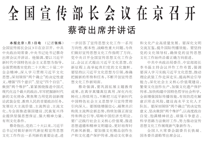 全国宣传部长会议3日在京召开。中共中央政治局常委、中央书记处书记蔡奇出席会议并讲话。他强调,要以习近平新时代中国特色社会主义思想为指导,全面贯彻落实党的二十大和二十届二中全会精神,深入学习贯彻习近平文化思想,深刻领悟“两个确立”的决定性意义,增强“四个意识”、坚定“四个自信”、做到“两个维护”,紧紧围绕推进中国式现代化这个最大的政治,牢牢把握新时代新的文化使命,聚焦聚力用党的创新理论武装全党、教育人民的首要政治任务,发展壮大主流价值、主流舆论、主流文化,为全面推进强国建设、民族复兴伟业提供坚强思想保证、强大精神力量、有利文化条件。(今日《人民日报》1版)
