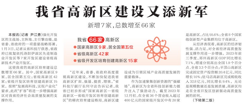 这使我省的高新区培育建设总数增至66家。其中,国家高新区9家,居全国第五位;省级高新区42家;省级开发区培育创建高新区15家。按照“发展高科技,实现产业化”要求,此次“扩容”将进一步增强高新区对我省经济社会高质量发展的支撑作用。(今日《河南日报》1版、2版)