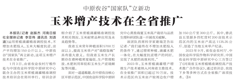 运用密植滴灌精准调控技术,不增加水肥投入,玉米大幅度抗逆,亩产平均增加150公斤以上。中原农谷“国家队”再立新功,这项玉米增产技术在全省推广。(今日《河南日报》1版)