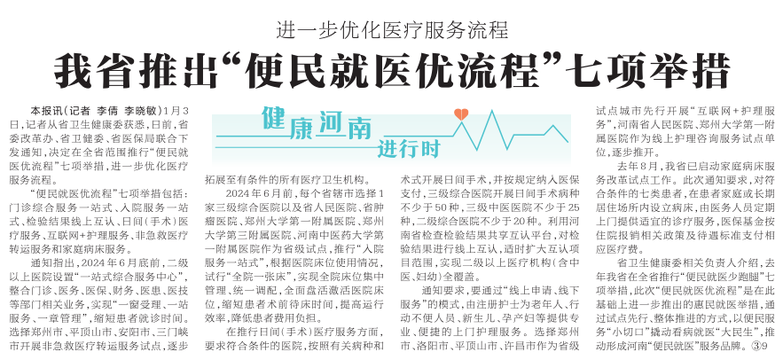 1月3日,记者从省卫生健康委获悉,日前,省委改革办、省卫健委、省医保局联合下发通知,决定在全省范围推行“便民就医优流程”七项举措,进一步优化医疗服务流程。