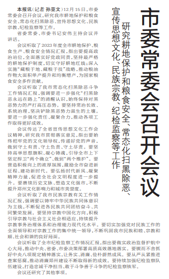 12月15日,市委常委会召开会议,研究我市耕地保护和粮食安全、常态化扫黑除恶、宣传思想文化、民族宗教、纪检监察等工作。
