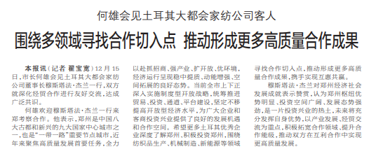 12月15日,市长何雄会见土耳其大都会家纺公司董事长穆斯塔法·杰兰一行,双方就深化经贸合作进行友好交流,达成广泛共识。(今日《郑州日报》1版)