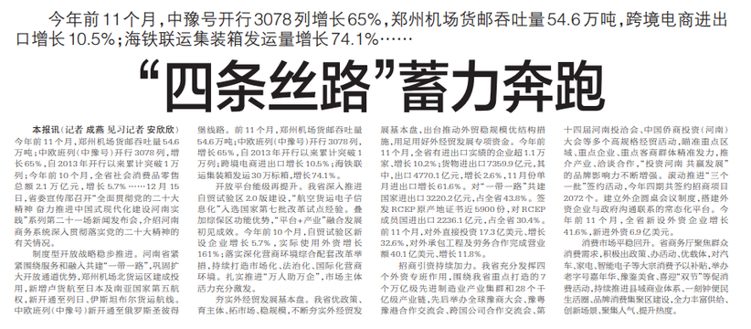今年前11个月,中豫号开行3078列增长65%,郑州机场货邮吞吐量54.6万吨,跨境电商进出口增长10.5%;海铁联运集装箱发运量增长74.1%……
