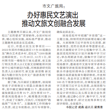 主题教育开展以来,市文广旅局党组以“实的要求”贯穿始终,全面对标对表,精心组织实施,高标准严要求,推动主题教育走深走实见成效。(今日《郑州日报》2版)