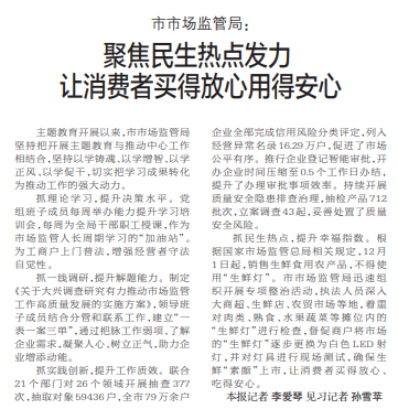 主题教育开展以来,市市场监管局坚持把开展主题教育与推动中心工作相结合,坚持以学铸魂、以学增智、以学正风、以学促干,切实把学习成果转化为推动工作的强大动力。(今日《郑州日报》2版)