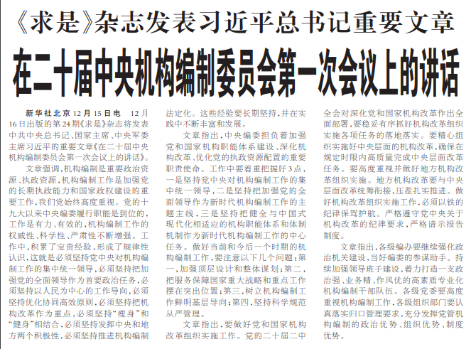 12月16日出版的第24期《求是》杂志将发表中共中央总书记、国家主席、中央军委主席习近平的重要文章《在二十届中央机构编制委员会第一次会议上的讲话》。(今日《人民日报》2版)