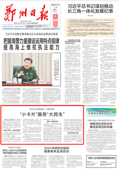 推行居民服务一卡通,是政府服务民生更有“温度”的具体体现。11月30日,《郑州市居民服务一卡通规定》以政府令形式予以发布,进一步推动我市建立居民服务一卡通服务管理模式,创新社会治理,提升公共服务能力,保障和改善民生。据了解,该《规定》于2024年1月1日起实施。(今日《郑州日报》1版、2版)