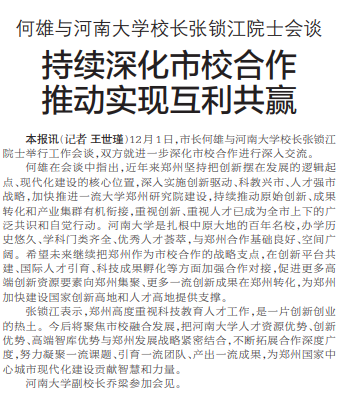 12月1日,市长何雄与河南大学校长张锁江院士举行工作会谈,双方就进一步深化市校合作进行深入交流。(今日《郑州日报》1版)