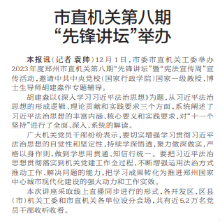 12月1日,市委市直机关工委举办2023年度郑州市直机关第八期“先锋讲坛”暨“宪法宣传周”宣传活动,邀请中共中央党校(国家行政学院)国家一级教授、博士生导师胡建淼作专题辅导。(今日《郑州日报》2版)