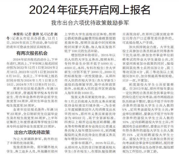 记者从市征兵办获悉,12月1日,2024年征兵工作启动,参与应征的青年可登录全国征兵网报名。(今日《郑州日报》2版)