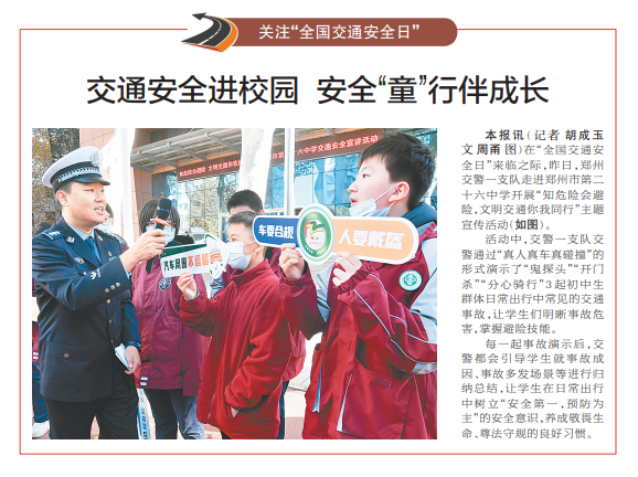 在“全国交通安全日”来临之际,昨日,郑州交警一支队走进郑州市第二十六中学开展“知危险会避险,文明交通你我同行”主题宣传活动。(今日《郑州日报》2版)