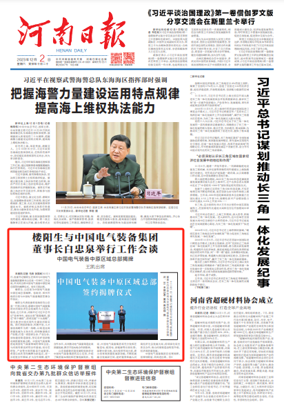 12月1日,省委书记楼阳生在郑州与中国电气装备集团董事长白忠泉一行举行工作会谈,并共同出席中国电气装备中原区域总部签约揭牌仪式。省长王凯出席。(今日《河南日报》1版)