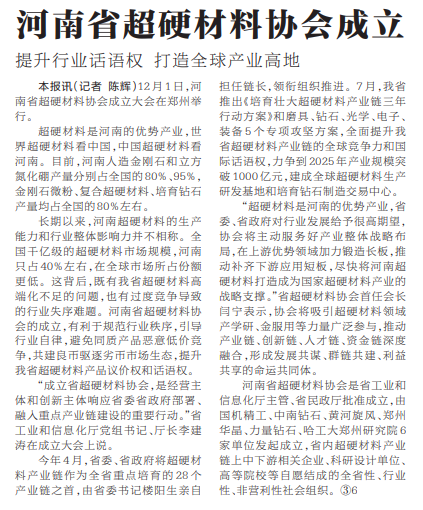 12月1日,河南省超硬材料协会成立大会在郑州举行。
