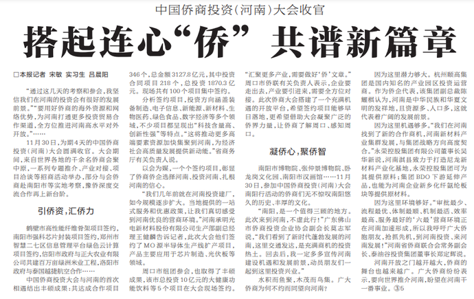 “通过这几天的考察和参会,我坚信我们在河南的投资会有很好的发展前景。”“要用好侨商的海外资源和网络优势,为河南打通更多投资贸易合作渠道,全方位推进河南高水平对外开放。”……(今日《河南日报》3版)