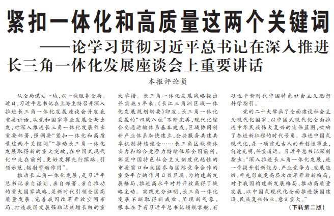 从全局谋划一域,以一域服务全局。近日,习近平总书记在上海主持召开深入推进长三角一体化发展座谈会并发表重要讲话,从党和国家事业发展全局出发,对深入推进长三角一体化发展作出重要部署,强调要“紧扣一体化和高质量这两个关键词”“推动长三角一体化发展取得新的重大突破,在中国式现代化中走在前列,更好发挥先行探路、引领示范、辐射带动作用”。(今日《人民日报》1版、2版)
