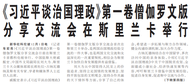 《习近平谈治国理政》第一卷僧伽罗文版分享交流会日前在斯里兰卡首都科伦坡举行。中国驻斯大使戚振宏、中国外文局副局长刘大为、斯里兰卡大众媒体部部长班杜拉·古纳瓦德纳及斯有关专家、学者和媒体界人士近百人出席。(今日《人民日报》1版、4版)