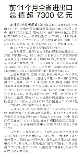 郑州海关昨日发布信息,今年前11个月,全省外贸进出口总值完成7359.9亿元。其中,出口4770.1亿元,增长2.6%,进口2589.8亿元,贸易顺差2180.3亿元,比去年同期扩大27.9%。11月当月,我省外贸进出口787.3亿元,同比增长61.6%,其中,出口499.1亿元,增长77.9%,进口288.2亿元,增长39.4%。(今日《郑州日报》1版)