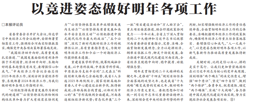 省委常委会召开扩大会议,传达学习中央经济工作会议精神,安排部署贯彻落实工作,强调结合河南实际狠抓落实,确保党中央各项决策部署落地见效。(今日《河南日报》1版)