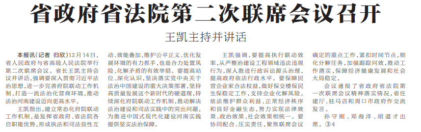 12月14日,省人民政府与省高级人民法院举行第二次联席会议。省长王凯主持会议并讲话,强调要深入贯彻习近平法治思想,进一步完善府院联动工作机制,打造一流法治化营商环境,推动法治河南建设迈向更高水平。(今日《河南日报》1版)