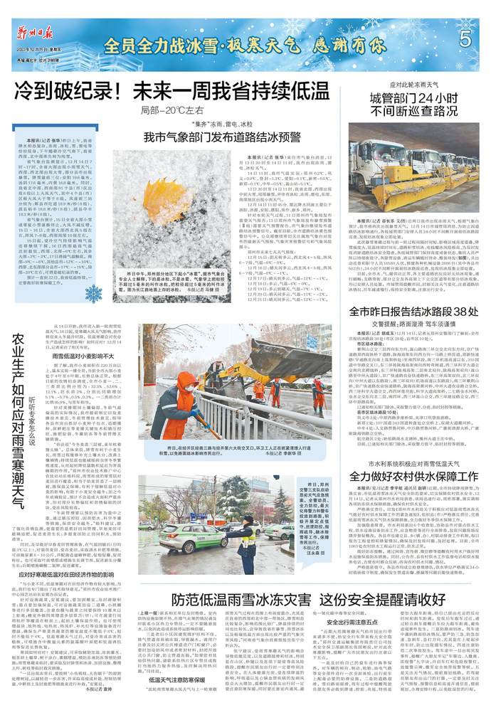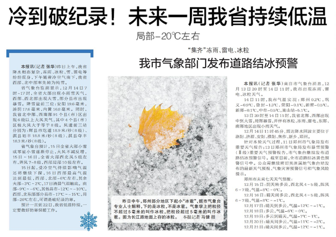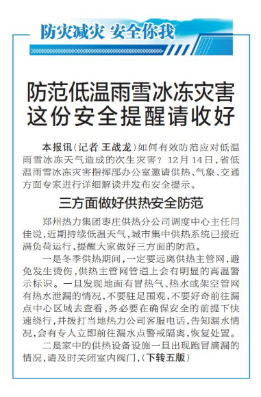 如何有效防范应对低温雨雪冰冻天气造成的次生灾害?12月14日,省低温雨雪冰冻灾害指挥部办公室邀请供热、气象、交通方面专家进行详细解读并发布安全提示。(今日《郑州日报》1版、5版)