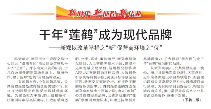 临近年末,新郑市公共资源交易中心网页,“潢川专区”项目建设信息几乎天天“上新”。豫东南大开发的热度,于几百公里外的新郑跃然屏上。新潢合作,源于新郑“莲鹤”交易品牌效应。(今日《郑州日报》1版、2版)