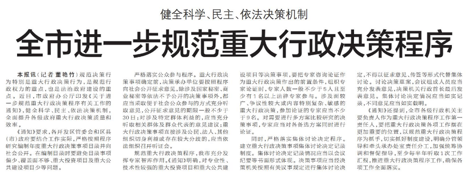 规范决策行为特别是重大行政决策行为,是规范行政权力的重点,也是法治政府建设的重点。近日,市政府办公厅印发《关于进一步规范重大行政决策程序有关工作的通知》,健全科学、民主、依法决策机制,全面提升各级政府重大行政决策质量和效率。(今日《郑州日报》2版)