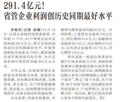 12月14日,记者从省政府国资委获悉,今年前11个月,41户省管企业共实现利润291.4亿元,累计实现利润再创历史同期最好水平,年度利润指标完成率达104%,提前超额完成年度利润目标任务,全年实现利润可望首次突破300亿元大关。(今日《河南日报》2版)