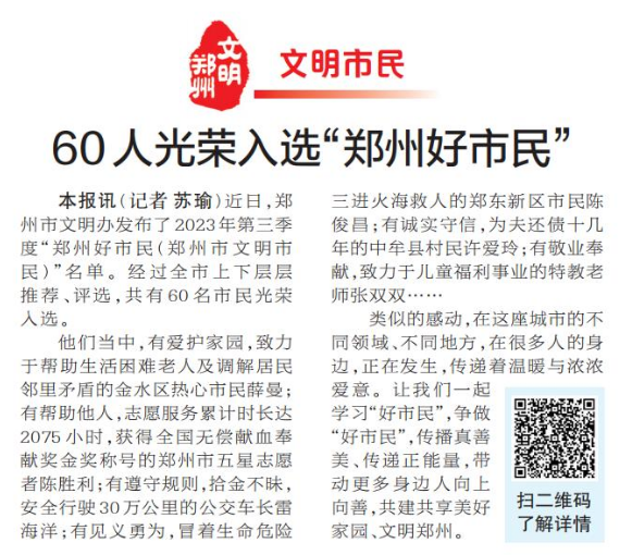近日,郑州市文明办发布了2023年第三季度“郑州好市民(郑州市文明市民)”名单。经过全市上下层层推荐、评选,共有60名市民光荣入选。(今日《郑州日报》2版)