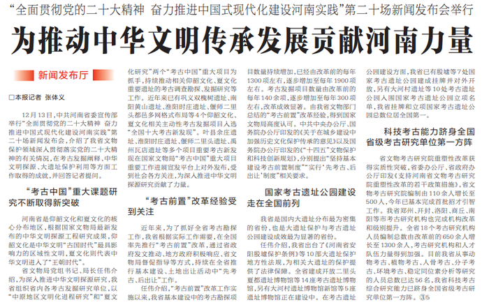 12月13日,中共河南省委宣传部举行“全面贯彻党的二十大精神奋力推进中国式现代化建设河南实践”第二十场新闻发布会,介绍了我省文物保护领域深入贯彻落实党的二十大精神的有关情况,在考古发掘阐释、中华文明探源、大遗址保护利用等方面工作取得的成就,并回答记者提问。(今日《河南日报》3版)