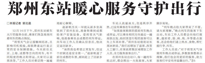 “雨雪天气会让接触网结冰,且影响司机视线,高铁降速运行是正常的安全保障措施。今天前往北京、上海、成都等方向的列车,有不同程度的晚点和停运,大家可以退票改签。”工作人员对着话筒一遍遍地耐心解释。(今日《河南日报》4版)