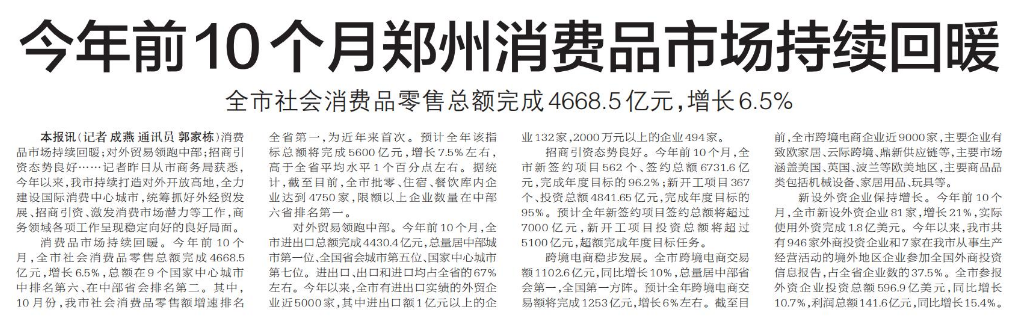 消费品市场持续回暖;对外贸易领跑中部;招商引资态势良好……记者昨日从市商务局获悉,今年以来,我市持续打造对外开放高地,全力建设国际消费中心城市,统筹抓好外经贸发展、招商引资、激发消费市场潜力等工作,商务领域各项工作呈现稳定向好的良好局面。(今日《郑州日报》7版)
