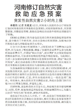 近日,河南省人民政府办公厅印发修订版《河南省自然灾害救助应急预案》,对组织指挥体系、灾害预警措施、灾情信息管理、救助应急响应启动条件和相应措施进行了明确。(今日《郑州日报》7版)