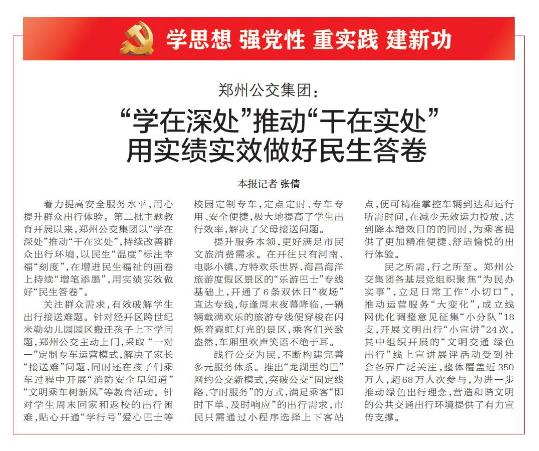 着力提高安全服务水平,用心提升群众出行体验。第二批主题教育开展以来,郑州公交集团以“学在深处”推动“干在实处”,持续改善群众出行环境,以民生“温度”标注幸福“刻度”,在增进民生福祉的画卷上持续“增笔添墨”,用实绩实效做好“民生答卷”。(今日《郑州日报》7版)
