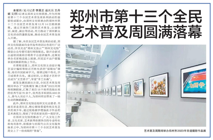 记者从郑州文化馆获悉,作为河南省第十三个全民艺术普及周系列活动的重要组成部分,由郑州文化馆承办的郑州市第十三个全民艺术普及周12月14日圆满落幕。通过开展各门类的艺术普及、公益培训、展览、演出等活动,有力推动了郑州群众文化活动的蓬勃发展,推动全民艺术普及深入开展。(今日《郑州日报》8版)