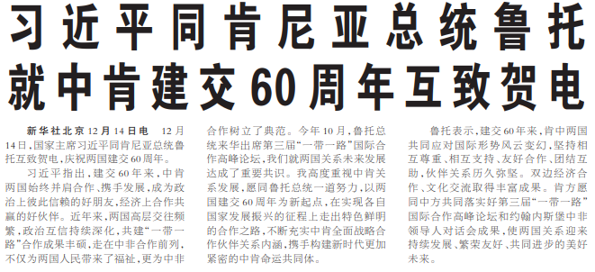 12月14日,国家主席习近平同肯尼亚总统鲁托互致贺电,庆祝两国建交60周年。(今日《人民日报》1版)
