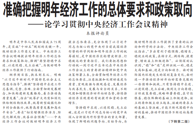 明年是中华人民共和国成立75周年,是实施“十四五”规划的关键一年,做好经济工作意义重大。中央经济工作会议明确提出明年经济工作的总体要求和政策取向,强调“要坚持稳中求进、以进促稳、先立后破”,为做好明年经济工作提供了行动指南。(今日《人民日报》1版、2版)
