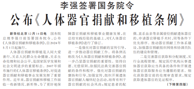 国务院总理李强日前签署国务院令,公布《人体器官捐献和移植条例》,自2024年5月1日起施行。(今日《人民日报》1版、4版)