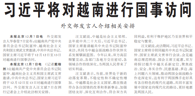 应越南共产党中央委员会总书记阮富仲、越南社会主义共和国主席武文赏邀请,中共中央总书记、国家主席习近平将于12月12日至13日对越南进行国事访问。外交部发言人汪文斌7日在例行记者会上介绍此访相关安排。(今日《人民日报》1版)