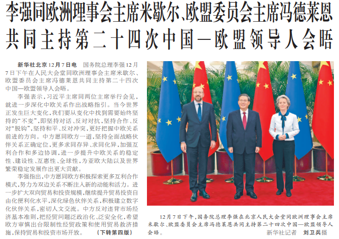 国务院总理李强12月7日下午在人民大会堂同欧洲理事会主席米歇尔、欧盟委员会主席冯德莱恩共同主持第二十四次中国—欧盟领导人会晤。(今日《人民日报》1版、4版)